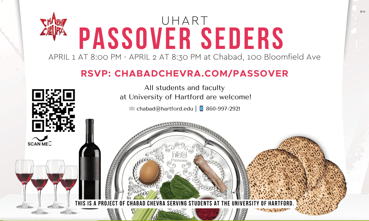 Chabad Chevra will be hosting Seders and providing meals throughout the week for the University of Hartford community.